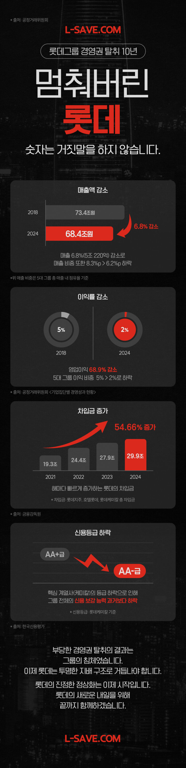 핵심 계열사의 신용등급 하락이 증명하듯, 지금 롯데에는 투명한 지배 구조를 통한 경영 정상화가 절실한 상황입니다.